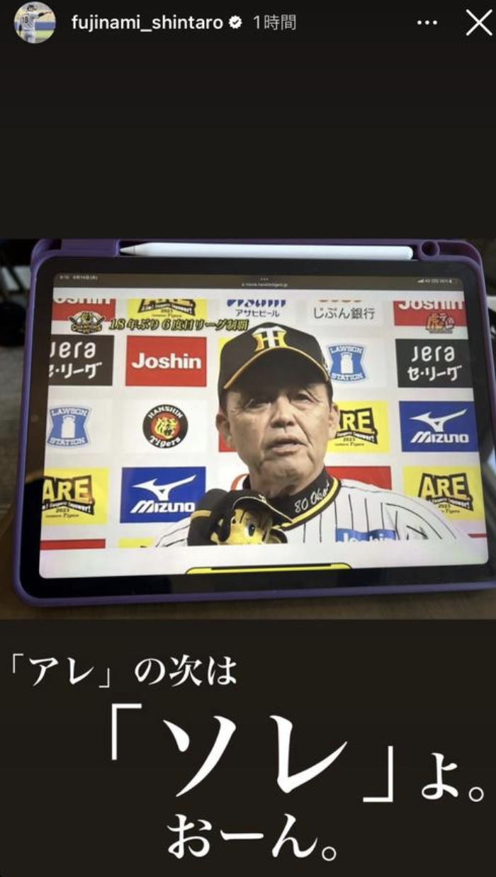 この藤浪が、Instagramのストーリーで、岡田監督のインタビューを見ながら
