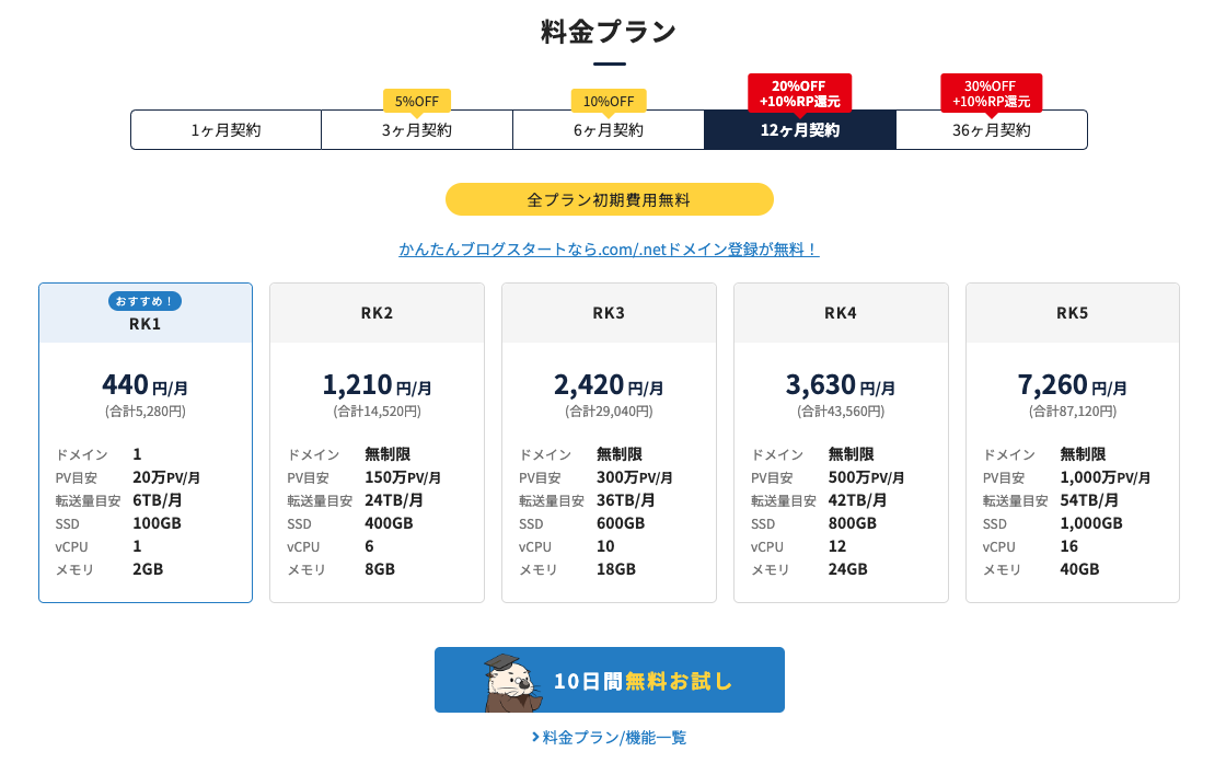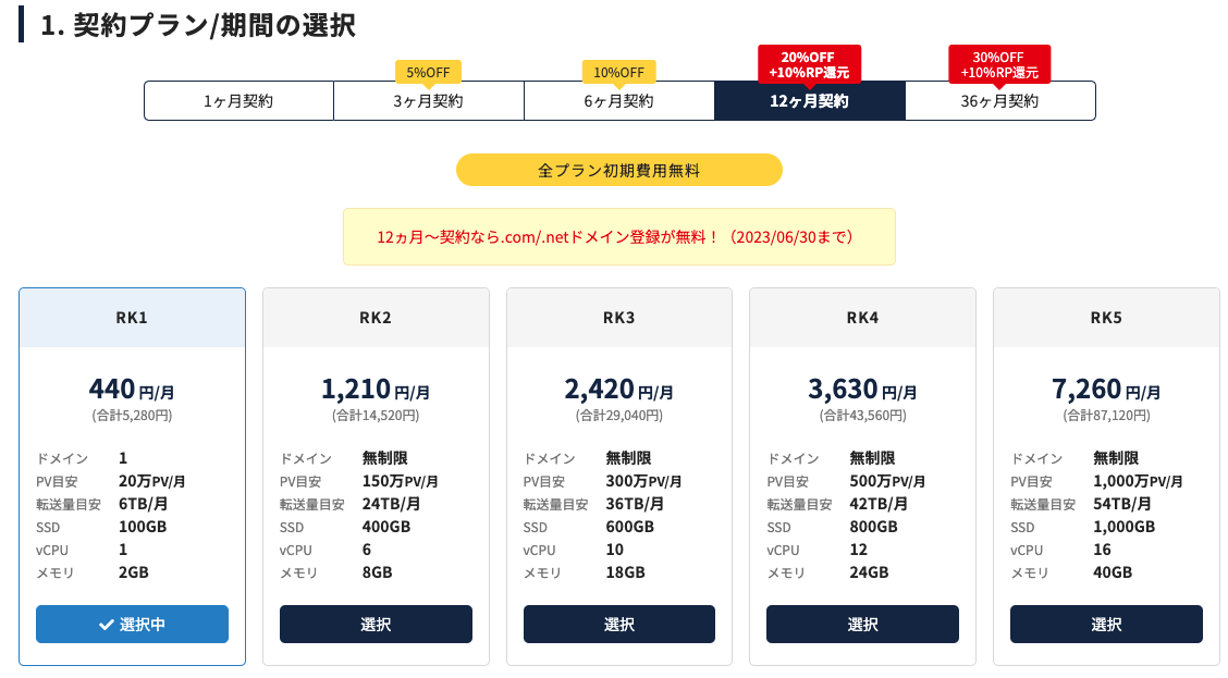 よほどアクセスが多いサイトでない限り、一番安い「RK1」で十分
