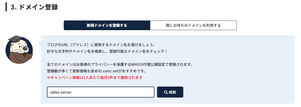 さらに、このラッコサーバー、「1年契約ならドメインが1年間無料」というサービスもあります。