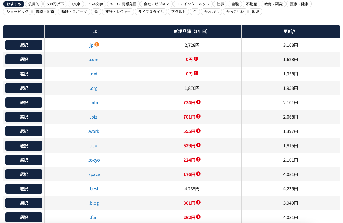 すると、TLD(トップレベルドメイン、要はドメインの末尾)ごとに、取得可能か否かが表示され、取得可能なものについては「選択」ボタンが表示されます。