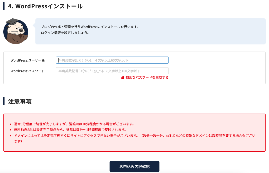通常のレンタルサーバー契約だと、契約後にWordPressをインストールする作業があったりするのですが、ラッコサーバーであれば、サーバー契約と合わせてWordPressのインストールができます。