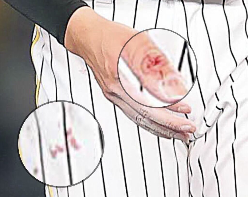 先発才木投手が親指を血に染めながらも5回1失点の粘りの投球。